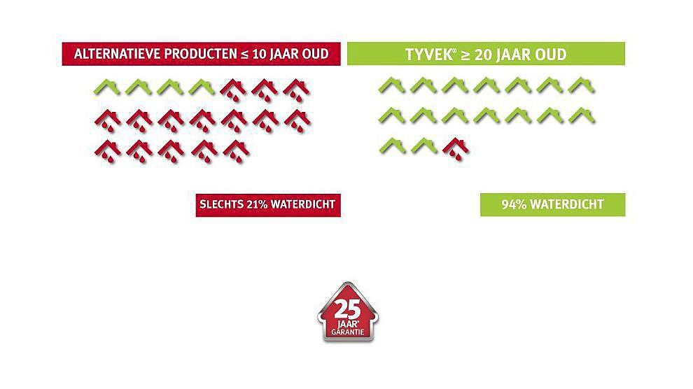 In navolging van de resultaten van de waterdichtheidstests in 2016, werden nog eens zes daken opengemaakt en hun onderdakfolies getest onder dezelfde strikte, onafhankelijke criteria. De daaruit volgende resultaten hebben de oorspronkelijke conclusies versterkt: Tyvek® biedt duurzame prestaties en gemoedsrust daar waar veel andere onderdakfolies tekortschieten. De percentages spreken voor zich: 94% van de Tyvek®-daken ouder dan 20 jaar slaagde met glans. Bij daken die minder dan 10 jaar oud zijn en met een andere onderlaag uitgerust zijn bleef slechts 21% waterdicht. Tyvek® is met andere woorden een betrouwbaar product. Daarom biedt DuPont nu een garantie tot 25 jaar* op Tyvek® onderdakmembranen.