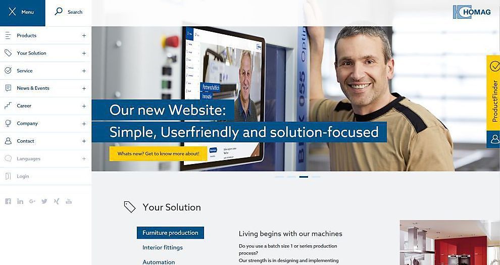 De Duitse machinebouwer Homag pakt uit met een vernieuwde website, www.homag.com. De site vertrekt volledig vanuit het standpunt van de gebruiker en herbergt een schat aan oplossingsgerichte informatie, rijkelijk aangevuld met inspirerende casestudies en getuigenissen. Of het nu gaat om schuurtechniek, platenmagazijnen, boor- en freescenters, of de grote CNC-bovenfreesmachines, alles is netjes en overzichtelijk ondergebracht onder één enkele URL.